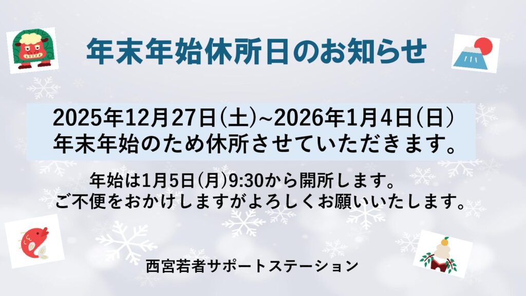 年末年始の西宮サポステの休所日についてお知らせします。