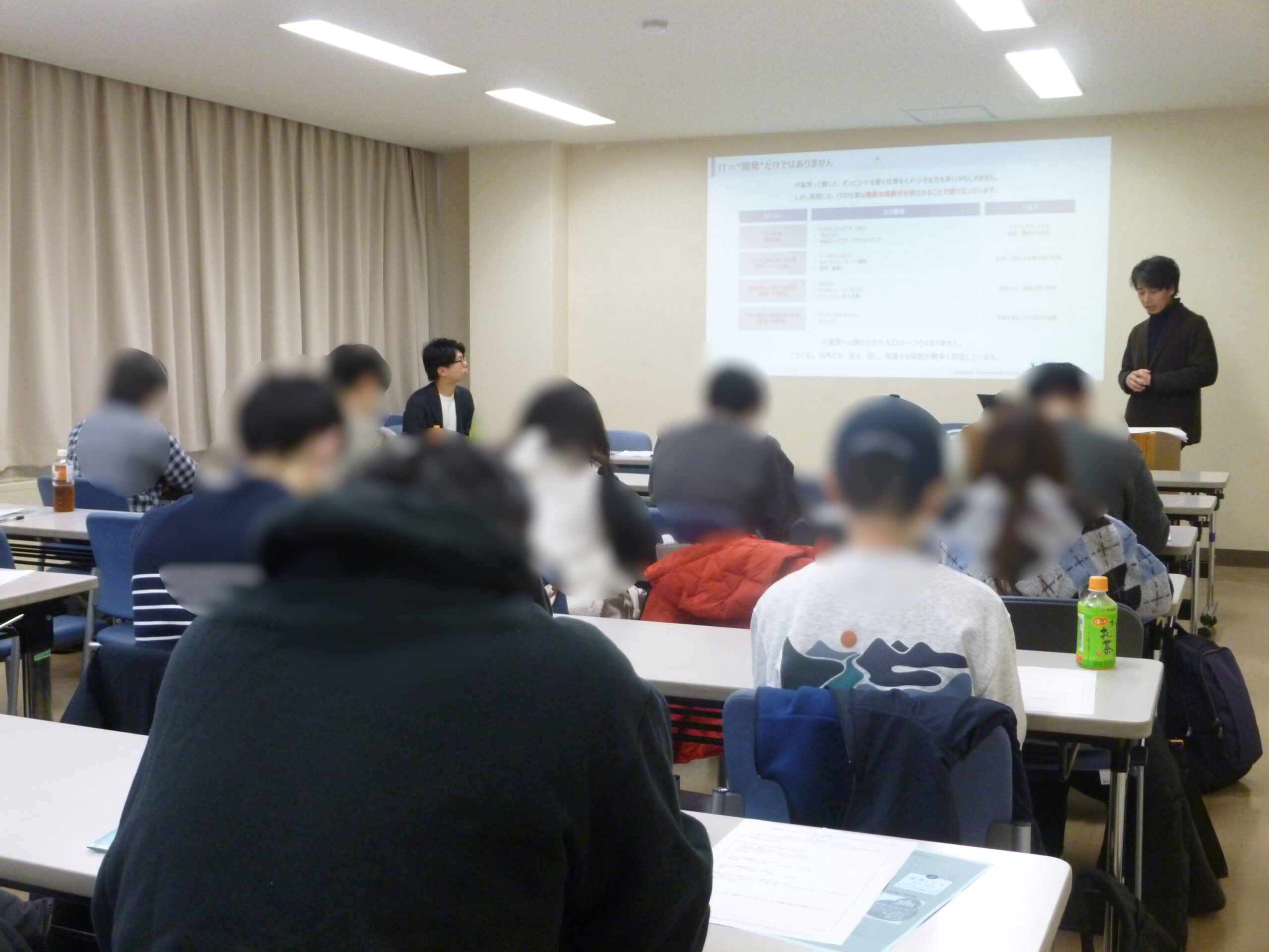 1月28日(水)・1月30日(金)の2日間、業界・仕事発見セミナー「アナタも知れば入りたくなる!IT業界」を株式会社プラスイノベーション様のご協力で実施しました。本日は、1月28日(水)に実施した「現役エンジニア×採用担当が語るこれからのIT業界と求められる人材とは?」のセミナーの様子をお伝えします。
