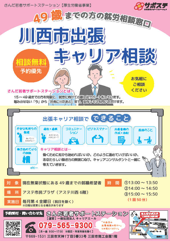さんだサポステでは、利用者の方々の「自宅の近くで相談したい!」という声にお応えするため、三田市内で3か所(まちづくり協働センター・ウッディタウン市民センター・フラワータウン市民センター(※))と、三木市、加東市、丹波篠山市、猪名川町、川西市、丹波市で出張キャリア相談を行っています。お近くの窓口をぜひご活用ください。